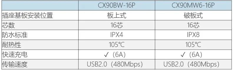“CX90MW6-16P”是將連接器嵌入基板安裝的破板式類型,由于沒有安裝高度,有助于設(shè)備的低薄化。此外,通過(guò)在內(nèi)部使用獨(dú)特結(jié)構(gòu)的零件實(shí)現(xiàn)了高基板固定強(qiáng)度,結(jié)合外殼所具備的螺絲孔,在安裝后進(jìn)行螺絲固定,可以進(jìn)一步提高固定強(qiáng)度。作為對(duì)環(huán)境的特性,實(shí)現(xiàn)了IPX8的高防水性能?!癈X90BW-16P”和“CX90MW6-16P”都具有105℃的高耐熱性,并且還支持6A高電流的高速充電。