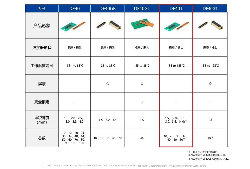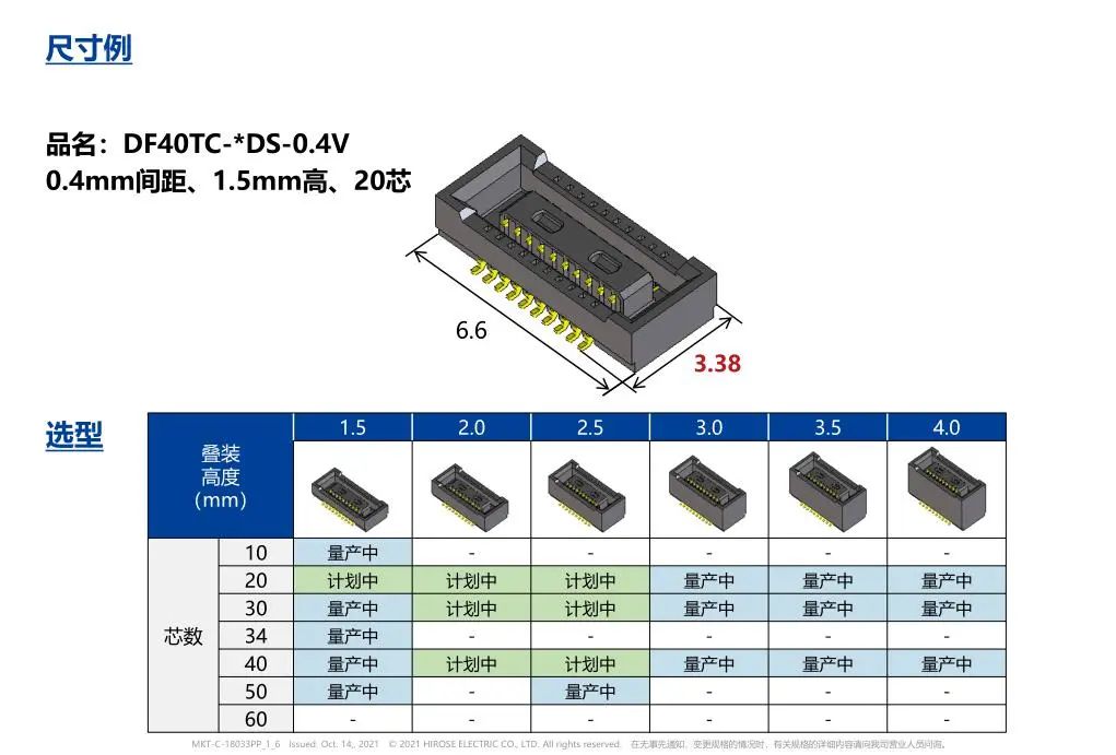 01 DF40系列 選型? 02 尺寸&選型 ? 03 車載應(yīng)用使用事例 ? 04 連接示意圖 ? 05 支持PCI Express 4.0 (16Gbps) 傳輸 ? 06 檢查用連接器 ? 07 推薦基板圖案 ? 08 規(guī)格 ? 如果應(yīng)用需要高度可靠性,例如汽車,請聯(lián)系公司代表以獲取更多信息。